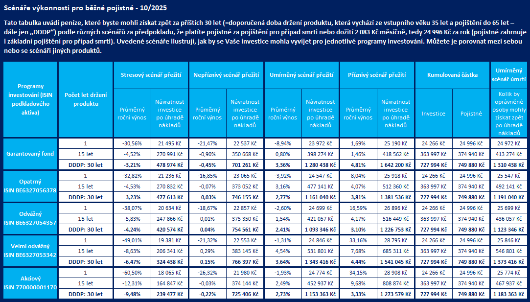 Tyto programy investování se odlišují investiční strategií, povahou podkladových aktiv a tím předpokládanou výnosností a mírou rizika. Podrobné informace o jednotlivých programech investování naleznete po kliknutí na daný program investování.